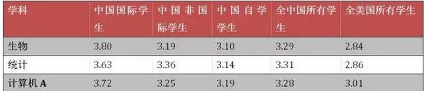 即使是中国学生普遍认为自己不擅长的理科,我们的优势也很明显。当然,和数理化经济学比起来,这几科的分数还是相对低一些。和其他科目类似,自学学生的分数也相对偏低。事实上,生物、统计以及计算机这样的学科专业性也非常强,很多专业性的词汇和方法自学是很难完全掌握的,所以如果是为了获得好成绩考试的学生,这几门考试自然不如微积分、物理C以及化学那么推荐,但是如果有专业方面的兴趣,也请大家不要担心分数问题,我们比起美国学生还是有很大的优势的。